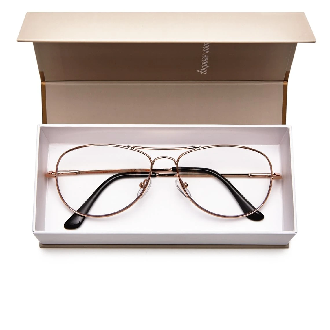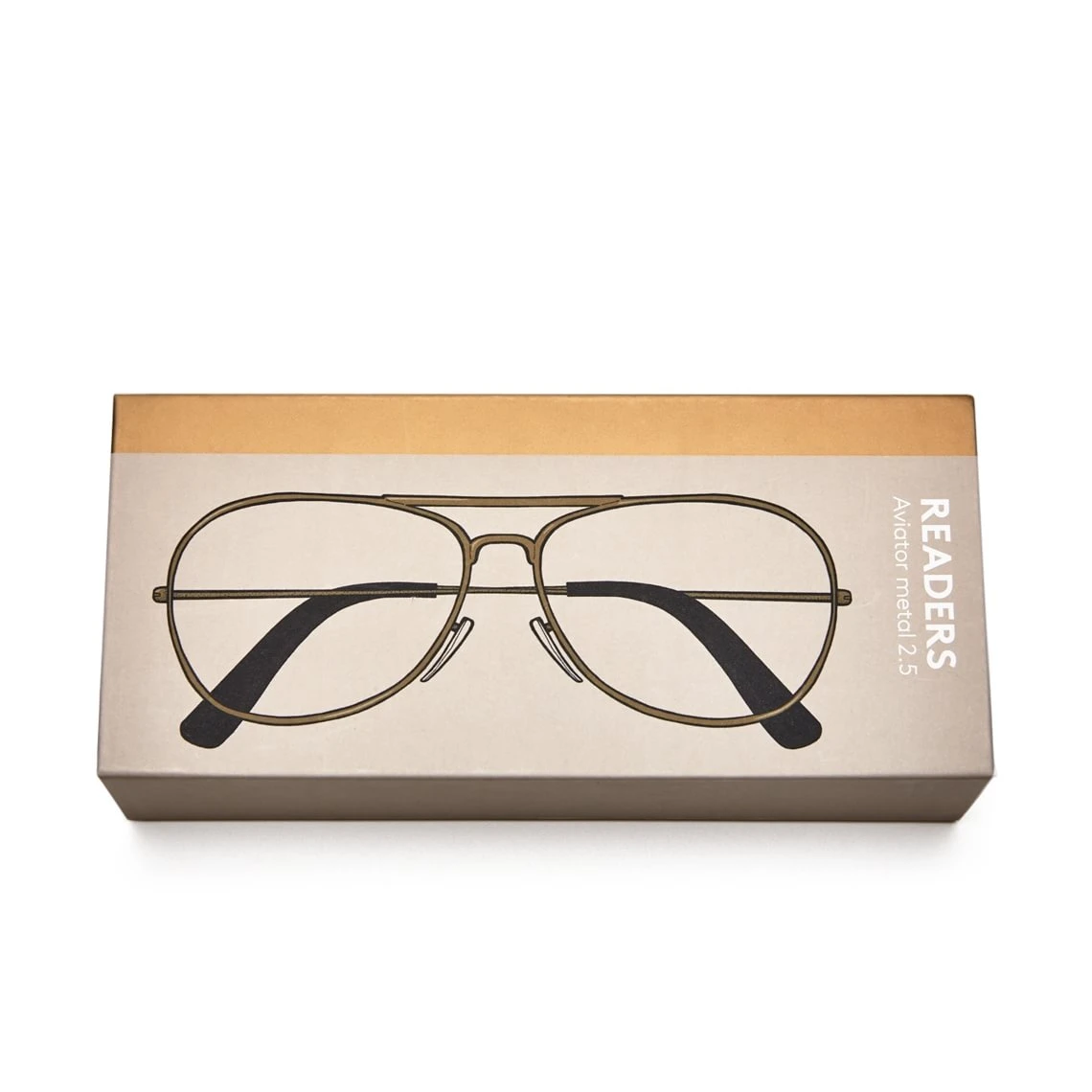 Et klassisk, let, pilotformet metalstel i guld farve. Kommer i et fint bogformat-etui med en pudseklud. Findes i styrkerne +1 til +2,0.