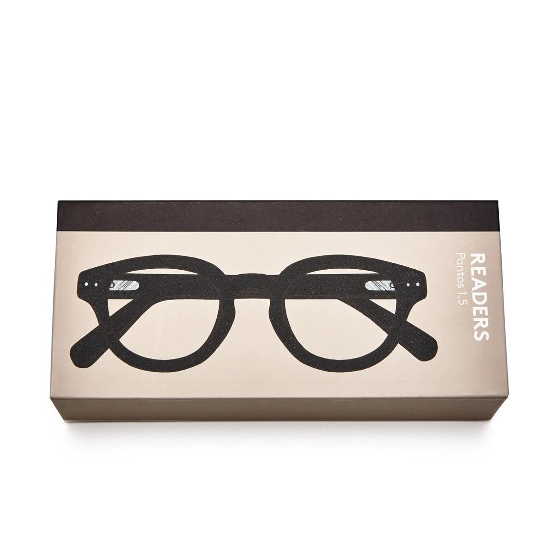 Et markeret unisex-stel i sort farve. Kommer i et fint bogformat-etui med en pudseklud. Findes i styrkerne +1 til +3,5.