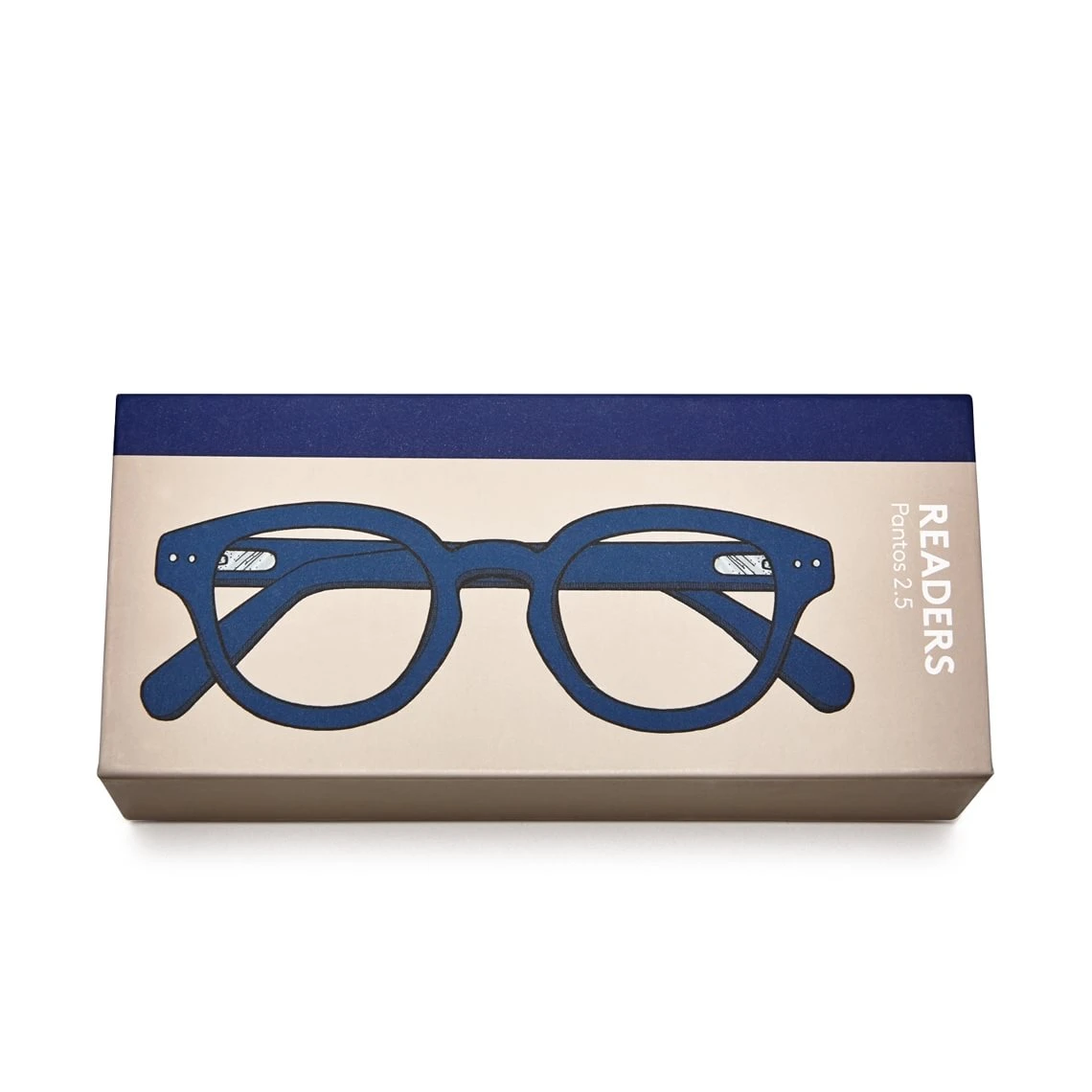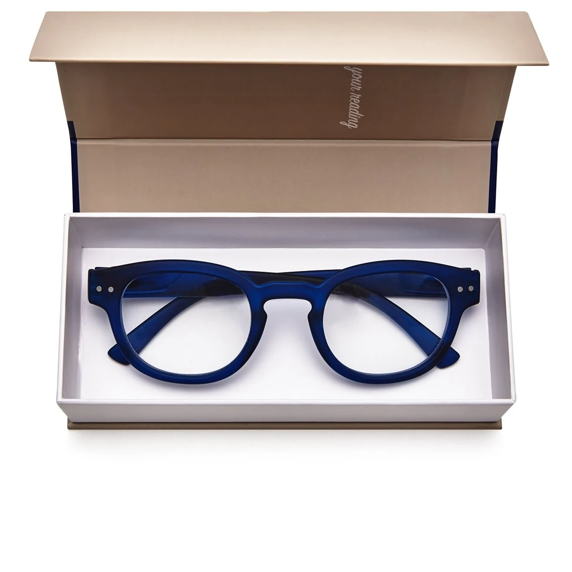 Et markeret unisex-stel i blå farve. Kommer i et fint bogformat-etui med en pudseklud. Findes i styrkerne +1 til +3,0.