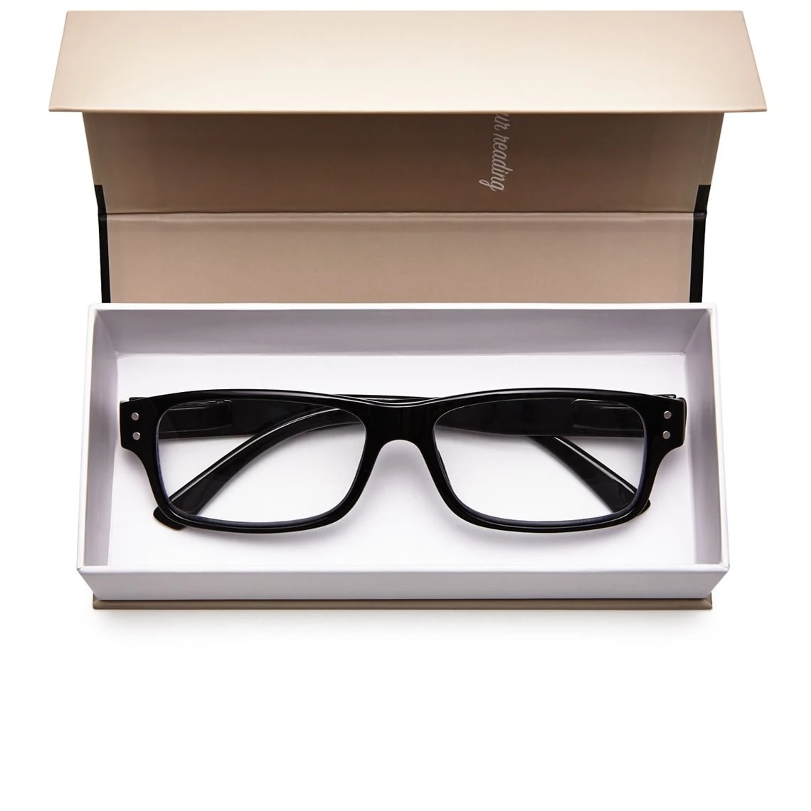 Stilrent unisex-stel i sort farve for et sofistikeret look. Kommer i et fint bogformat-etui med en pudseklud. Findes i styrkerne +1 til +3,5.