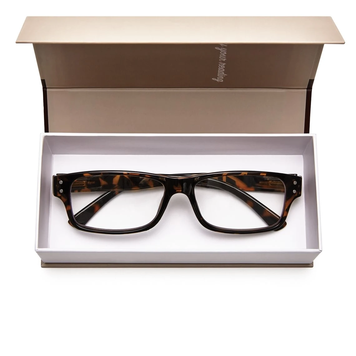 Stilrent unisex-stel i skildpaddemønstret for et sofistikeret look. Kommer i et fint bogformat-etui med en pudseklud. Findes i styrkerne +1 til +3,0.