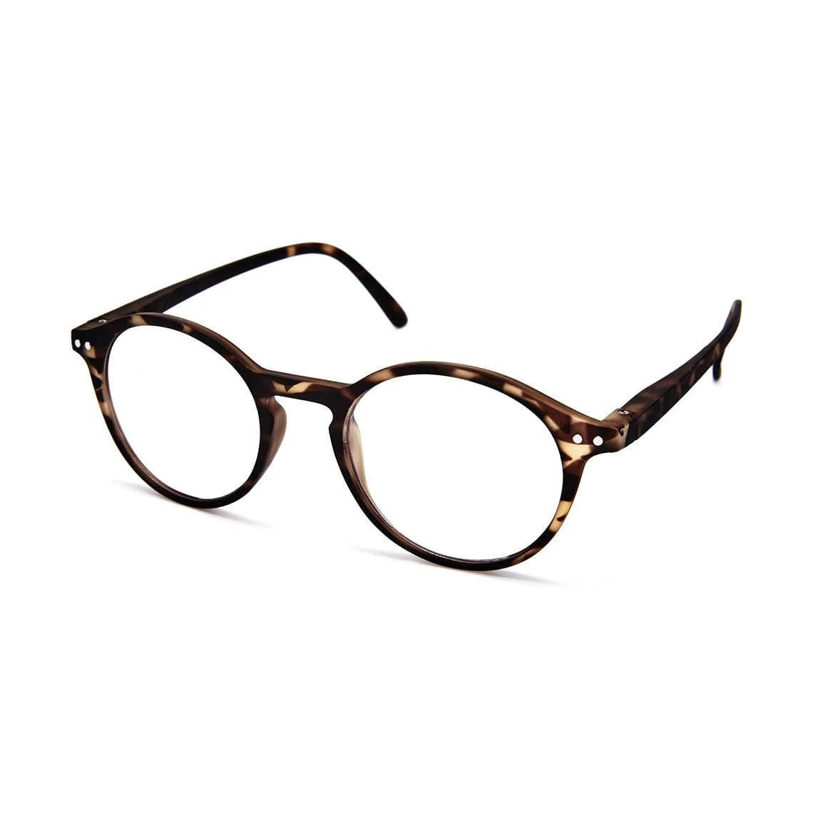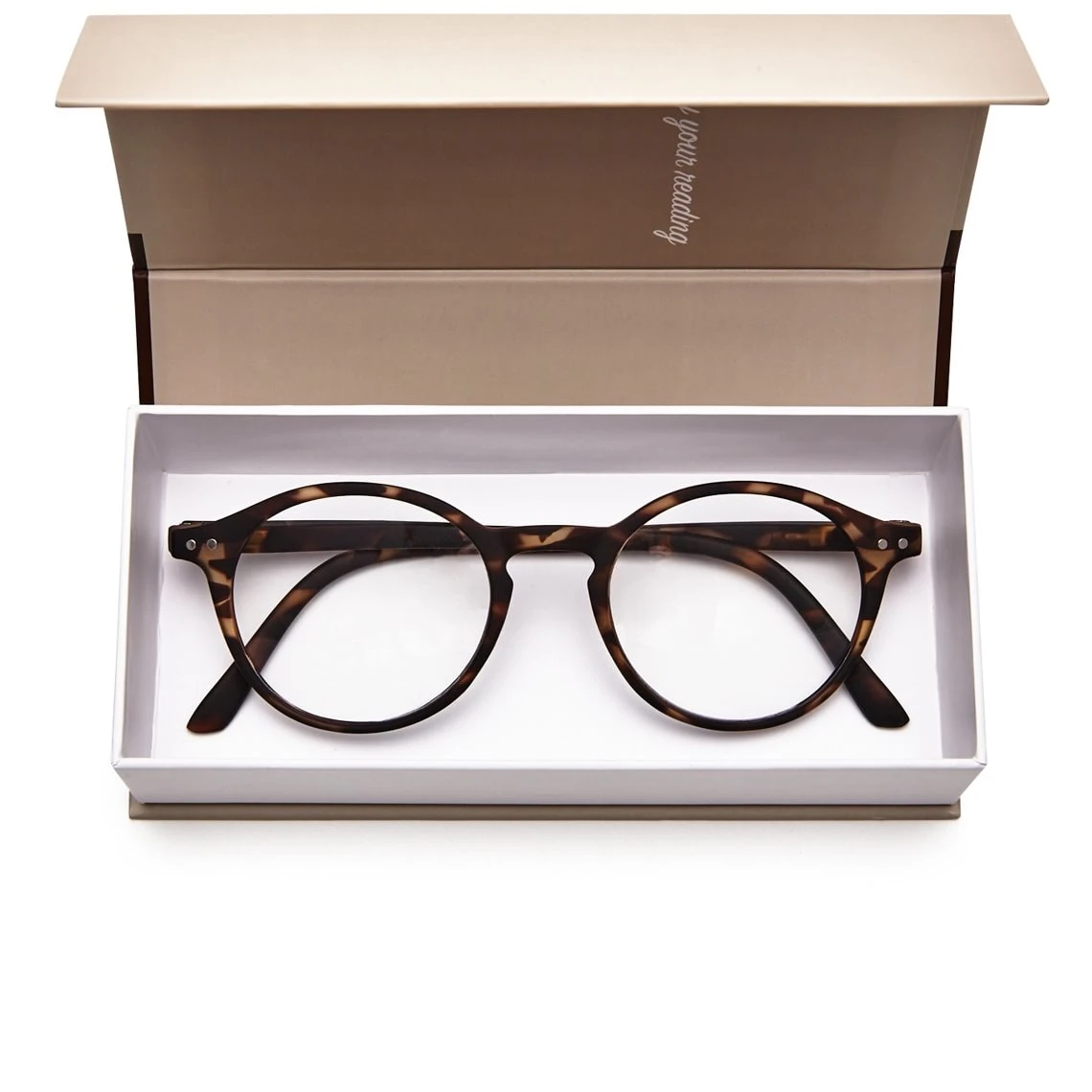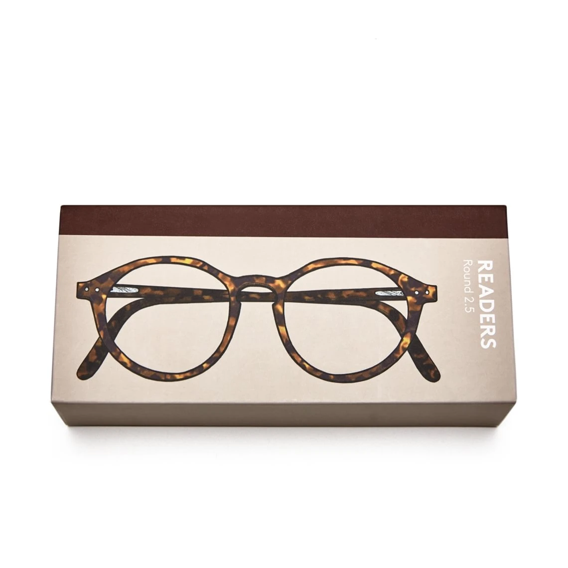Et tyndt rundt stel i skildpaddemønstret. Kommer i et fint bogformat-etui med en pudseklud. Findes i styrkerne +1 til +3,0.